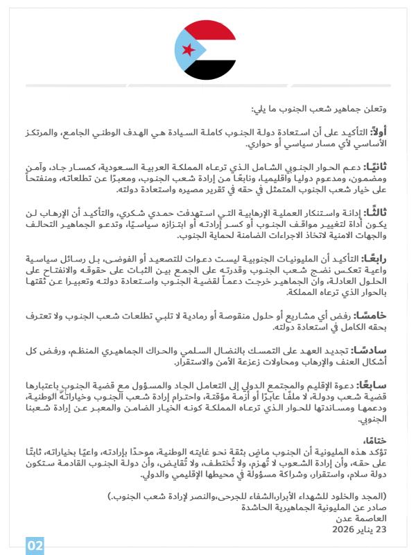 رابعًا: التأكيد أن المليونيات الجنوبية ليست دعوات للتصعيد أو الفوضى، بل رسائل سياسية واعية تعكس نضج شعب الجنوب وقدرته على الجمع بين الثبات على حقوقه والانفتاح على الحلول العادلة، وان الجماهير خرجت دعماً لقضية الجنوب واستعادة دولته وتعبيرا عن ثقتها بالحوار الذي ترعاه المملكة.