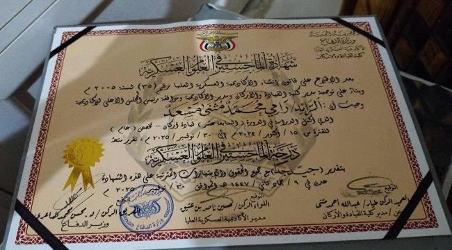 في لفتة تستحق الاحترام ، أعلن المقدم ركن رامي محمد مثنى الصميدي (أبو مهتم)، إهداء نجاحه وتخرجه من الأكاديمية العسكرية العليا وحصوله على درجة الماجستير في العلوم العسكرية، إلى الشخصية القيادية البارزة أحمد بن أحمد الميسري.