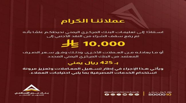 أعلن بنك عدن الإسلامي للتمويل الأصغر، استنادًا إلى تعليمات البنك المركزي اليمني، عن رفع سقف شراء النقد الأجنبي إلى 10,000 ريال سعودي أو ما يعادله من العملات الأخرى، وفق سعر الصرف المعتمد من البنك المركزي اليمني المحدد بـ 425 ريال يمني.