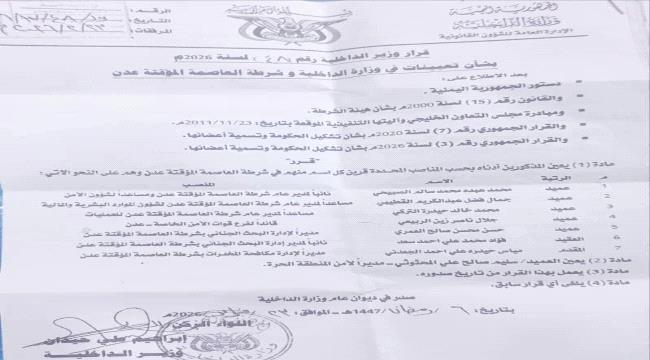 اصدر وزير الداخلية قرارات تعينات في عدن وكان كالآتي: