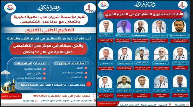 في إطار الجهود الإنسانية الرامية إلى تعزيز خدمات الرعاية الصحية المجانية تُنظم مؤسسة شريان عدن الطبية الخيرية بالتعاون مع مركز عدن التشخيصي مخيماً طبياً خيرياً متخصصاً وذلك خلال الفترة من 10 إلى 17 رمضان، في مقر مركز عدن التشخيصي بالعاصمة المؤقتة عدن.