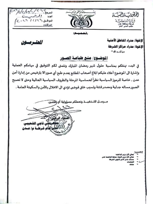 كما تطرق الجنيدي إلى التعميم الموجّه إلى المطابع بعدم الطباعة إلا بترخيص، والذي يُعتقد أنه جاء على خلفية اللوحات التي رُفعت واستحضرت أحداثًا مؤلمة سقط فيها ضحايا وشهداء من القوات الجنوبية المسلحة جراء قصف الطيران في حضرموت والضالع. واعتبر أن مثل هذه الخطوات لا تسهم في إعادة بناء جسور الثقة، بل قد تُفهم باعتبارها ممارسات استفزازية.