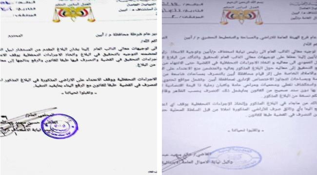 وجاء ذلك في مذكرة رسمية صادرة عن نيابة استئناف محافظة أبين، برقم (54) وتاريخ 1 مارس 2026م، نشرها المستشار نبيل العمودي، تضمنت توجيه مدير عام شرطة المحافظة باتخاذ التدابير القانونية اللازمة لوقف الاعتداءات على الأراضي المشمولة بالبلاغ، إلى حين استكمال إجراءات التحقيق والتصرف في القضية وفقًا لأحكام القانون.