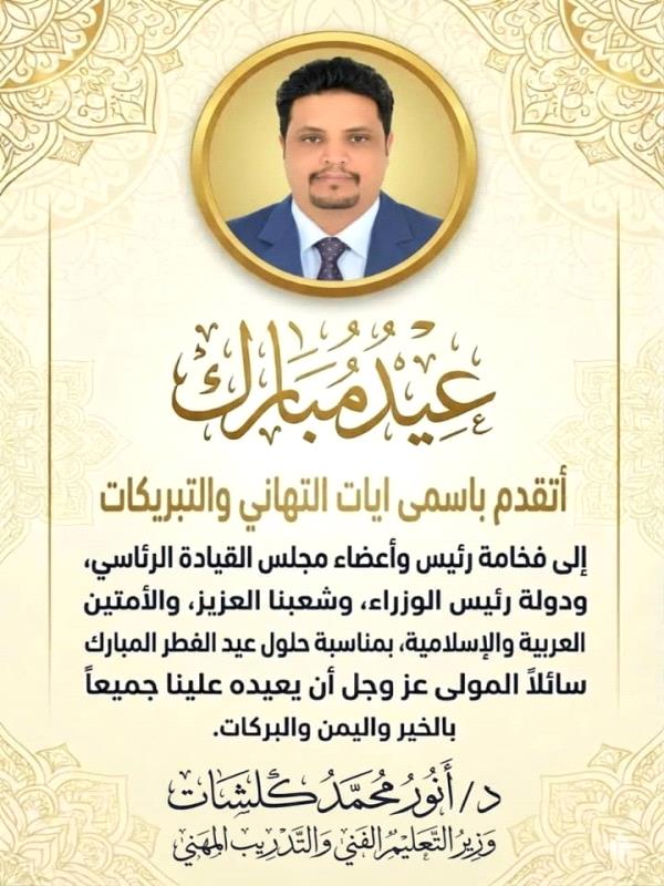 رفع وزير التعليم الفني والتدريب المهني معالي الدكتور أنور محمد كلشات المهري أسمى آيات التهاني والتبريكات إلى القيادة السياسية ممثلة بفخامة الدكتور رشاد محمد العليمي رئيس مجلس القيادة الرئاسي وأعضاء المجلس، وإلى دولة رئيس الوزراء الدكتور شائع الزنداني بمناسبة حلول عيد الفطر المبارك 1447هـ، سائلاً الله أن يعيده عليهم وعلى الشعب اليمني والأمتين العربية والإسلامية بالخير واليُمن والبركات، وأن يمن عليهم بموفور الصحة والعافية.
