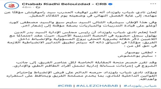 وأوضح البيان أن الثنائي سليم سبع ومصطفى كورد أوغلو سيتوليان قيادة التدريبات والمباريات بشكل مؤقت، لحين اتخاذ القرار النهائي بشأن الجهاز الفني للفريق.