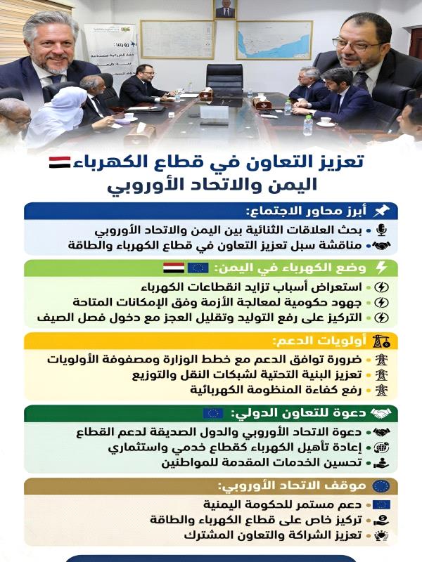 ودعا معاليه دول الاتحاد الأوروبي والدول الصديقة والشقيقة إلى دعم قطاع الكهرباء والطاقة لاستعادة وضعه الطبيعي كقطاع خدمي واستثماري، بما يسهم في تحسين الخدمات المقدمة للمواطنين، مشيراً إلى التحديات التي يواجهها اليمن وانعكاساتها على حياة المواطنين.