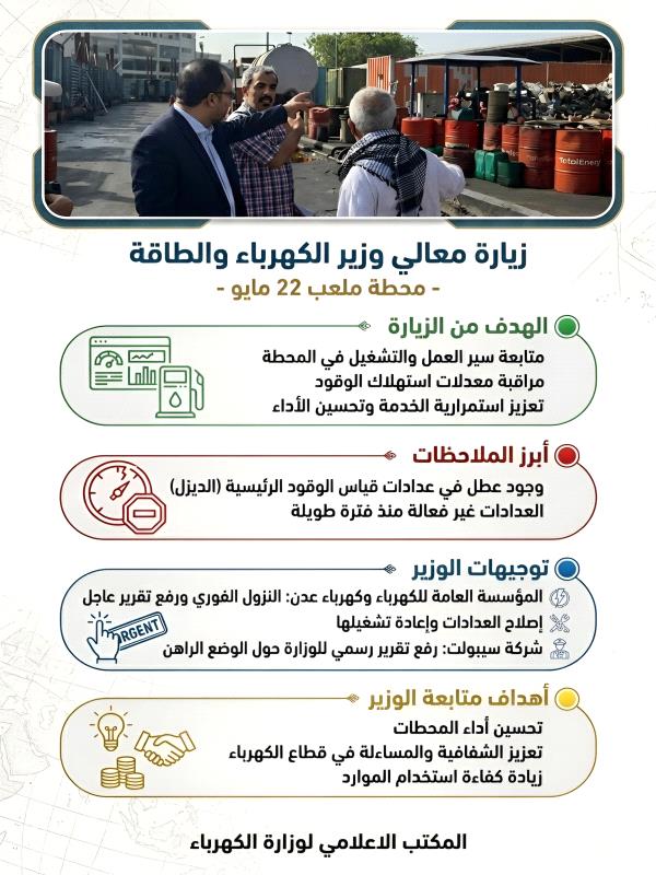 ووجه معالي الوزير المؤسسة العامة للكهرباء وكهرباء عدن بالنزول الفوري إلى المحطة ورفع تقرير عاجل عن الوضع الحالي، مع اتخاذ كافة الإجراءات اللازمة لإصلاح العدادات وإعادة تشغيلها.