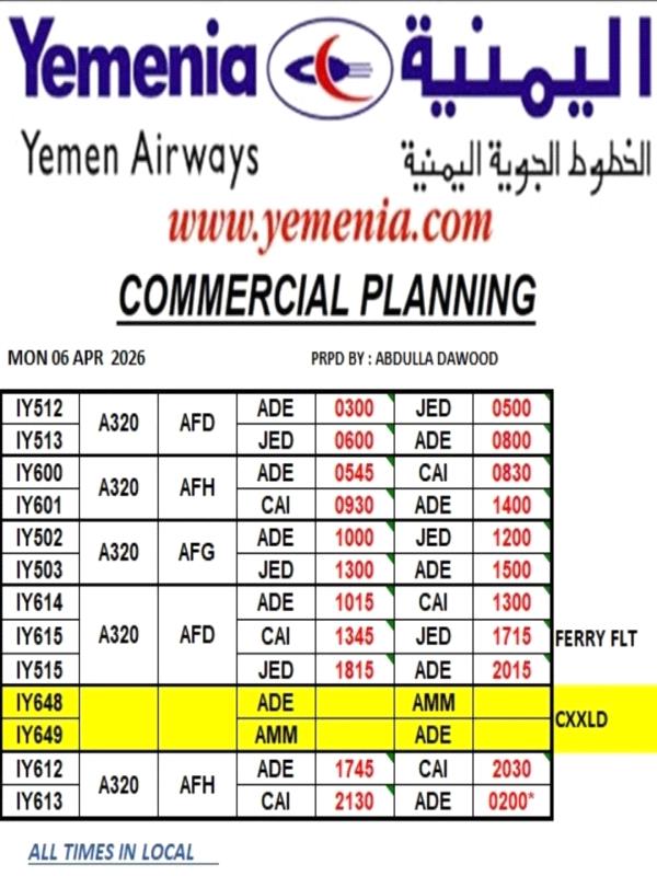 مواعيد رحلات طيران اليمنية ليوم الاثنين - 6 أبريل 2026م