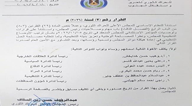 أصدرت رئاسة المجلس الأعلى للحراك الثوري لتحرير واستقلال الجنوب القرار رقم (2) لسنة 2023م، في خطوة تهدف إلى إعادة ترتيب البنية التنظيمية وتفعيل أداء الدوائر القيادية.