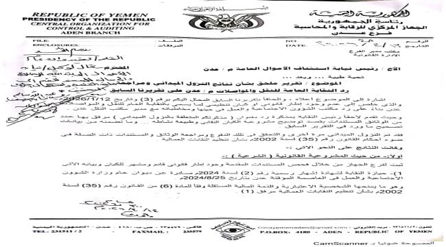 أظهر تقرير ملحق صادر عن فرع الجهاز المركزي للرقابة والمحاسبة في عدن بتاريخ 13 أبريل 2026م ، والمرفوع إلى رئيس نيابة استئناف الأموال العامة، نتائج مغايرة لما ورد في التقرير السابق للجهاز الصادر في تاريخ 12 يناير 2026م ، مؤكداً وجود إطار قانوني سليم للنقابة العامة للنقل والمواصلات بعدن، ومصححاً جملة من الاستنتاجات التي بُنيت على معلومات غير مكتملة.