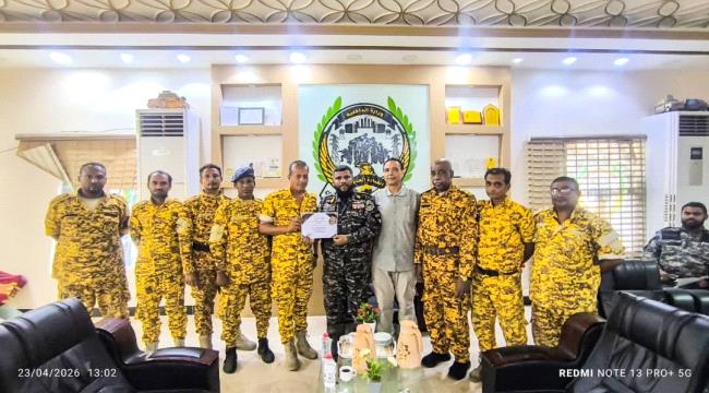 كرم القائد العام لقوات حرس المنشآت وحماية الشخصيات العميد أحمد مهدي بن عفيف اليوم عدد من أفراد قوات حرس المنشآت الذين يتولون مهام تأمين البنك المركزي في العاصمة عدن وذلك تقديرا لدورهم بالقبض على قاتل الشاب زكريا.