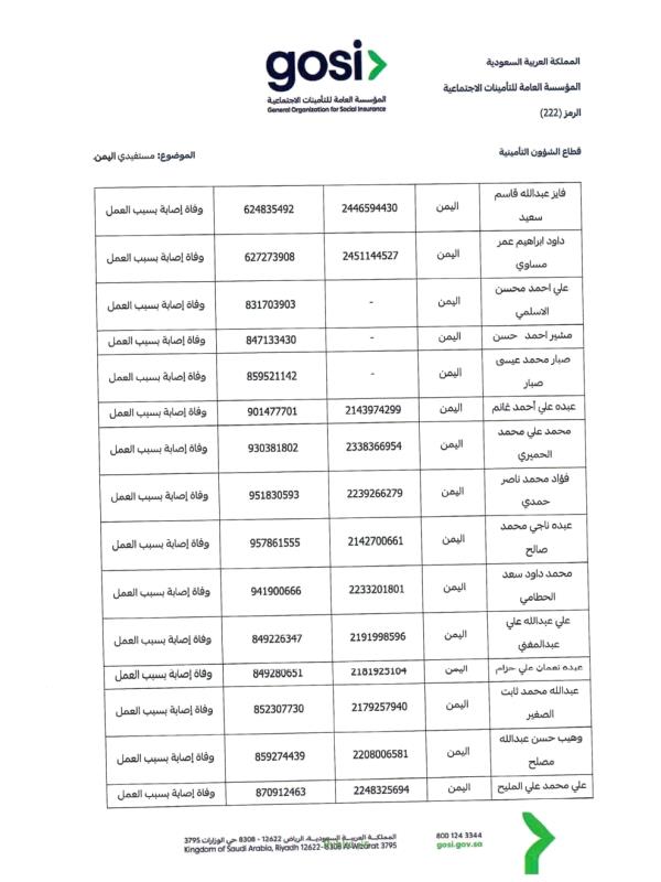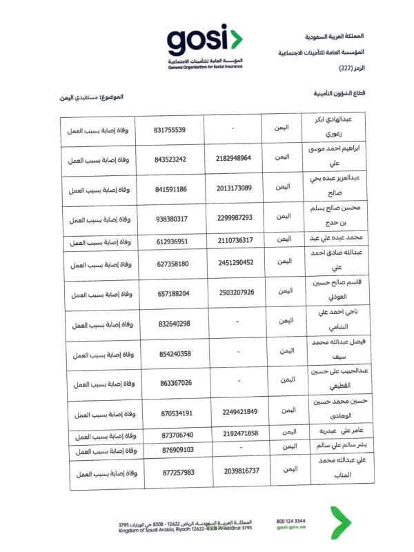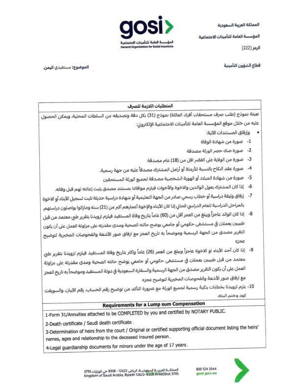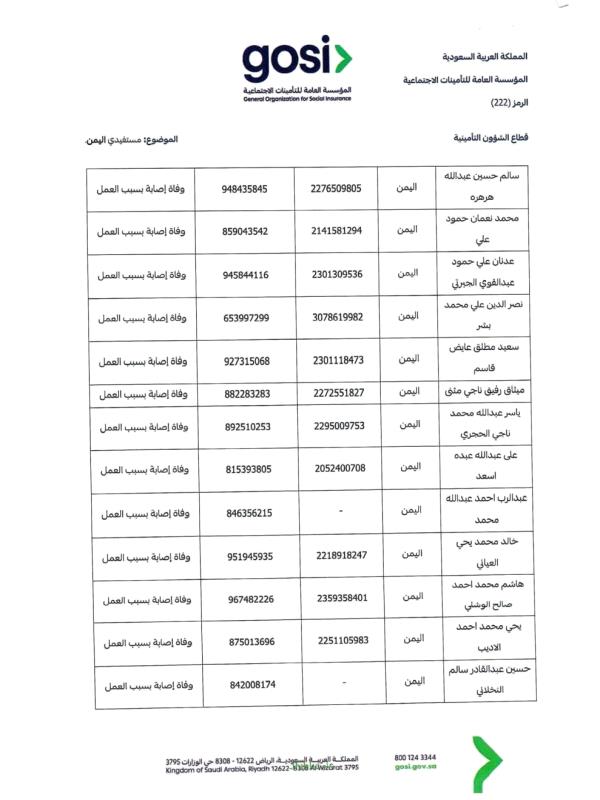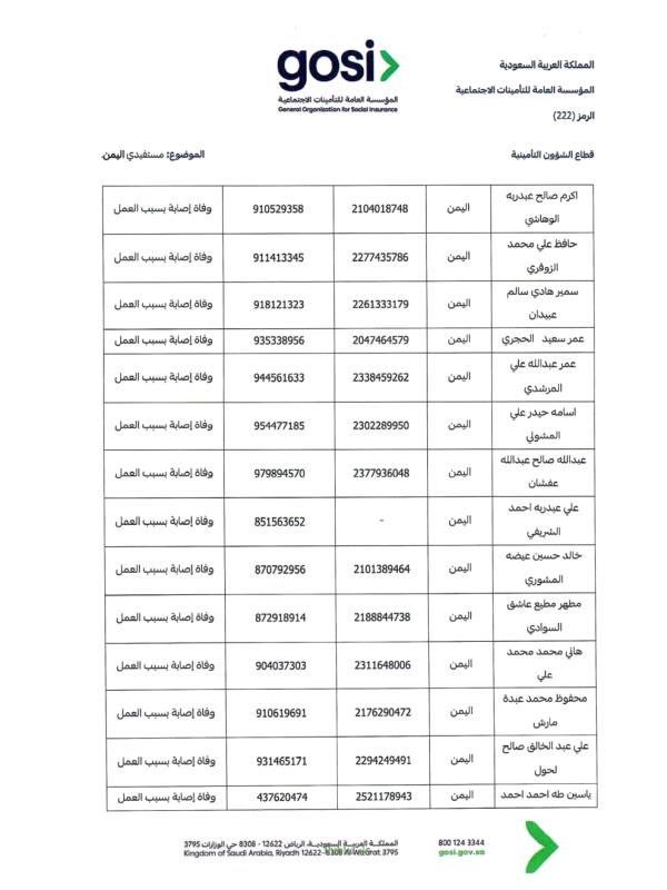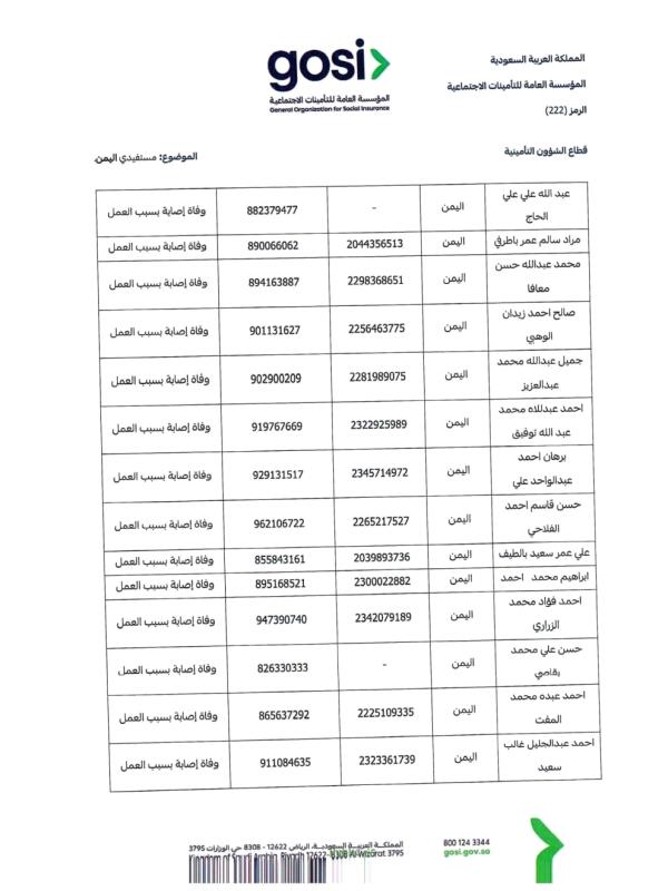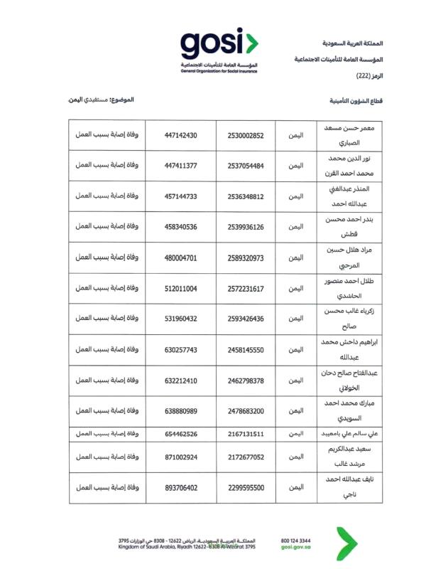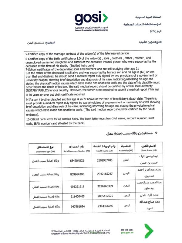 ودعت السفارة "ذوي المتوفين الواردة أسماؤهم في الكشف المرفق إلى سرعة مراجعة المتطلبات اللازمة، واستكمال الوثائق المطلوبة عبر القنوات الرسمية للمؤسسة العامة للتأمينات الاجتماعية، أو التواصل مع السفارة للحصول على الإرشادات اللازمة"، بما يضمن حفظ حقوق الورثة واستكمال إجراءات الصرف وفق الأنظمة المعمول بها.