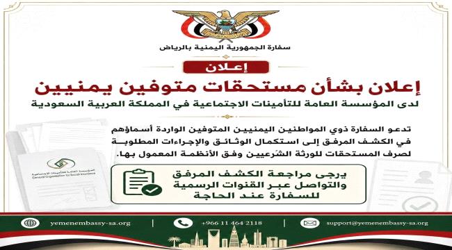 دعت السفارة اليمنية في الرياض، ذوي أكثر من 100 مواطن يمني متوفين إلى استكمال إجراءات صرف مستحقاتهم التأمينية لدى المؤسسة العامة للتأمينات الاجتماعية في السعودية، مؤكدة أن هذه المستحقات لم تُصرف حتى الآن لورثتهم الشرعيين.