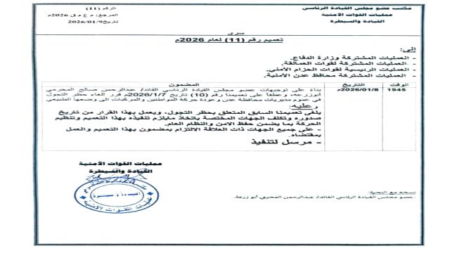 تؤكد قيادة وزارة الدفاع ورئاسة هيئة الأركان العامة إلتزامها التام بالقرارات والاجراءات الصادرة عن مجلس الدفاع الوطني ومجلس القيادة الرئاسي، والقرارات